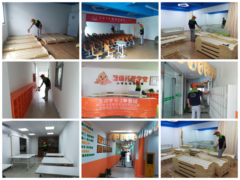 接到晋级托管学堂的委托后,我们深感责任重大。立即派出专家团队进行实地勘察,量身定制了科学、彻底的甲醛治理方案:1. 深度渗透: 使用专业药剂,对课桌、椅子、书柜、地板、墙面等所有污染源进行360°无死角喷涂,从源头分解甲醛,而非简单覆盖。2. 精准打击: 针对密闭空间如储物柜、抽屉等,采用高温熏蒸技术,加速甲醛释放并进行高效清除。3. 安全承诺: 所有使用的治理产品均对人体无害,无毒无腐蚀,施工后不留痕迹,只留下清新空气。